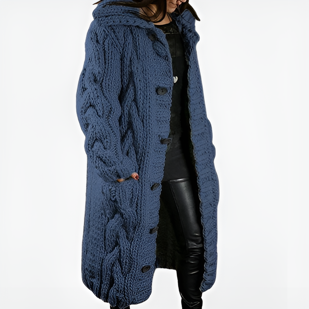 • Universāls stils — klasiskas krāsas un izteikts raksts: garais siluets, kapuce un dekoratīvais pīņu pinums piešķir eleganci un padara to viegli kombinējamu gan ar ikdienas, gan svinīgiem tērpiem.