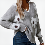 • Sieviešu elegance — V veida izgriezums un ziedu motīvs: piešķir džemperim izteiktu sievišķību, padarot to viegli saskaņojamu ar džinsiem vai svārkiem gan ikdienā, gan izbraucienos.