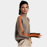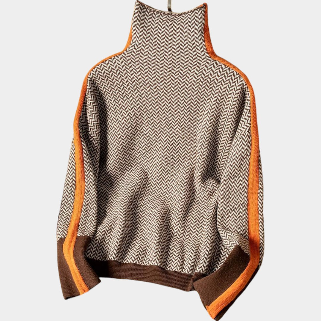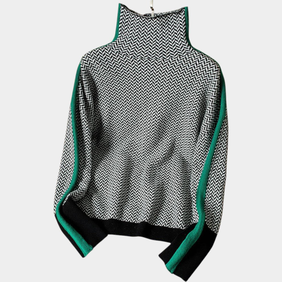 Maija™ | Džemperis ar augstu apkakli apvieno stilu un komfortu izsmalcinātā dizainā. Izteiksmīgais raksts ar kontrastējošām joslām izceļ siluetu, bet augstais apkaklis piešķir šarmu un nodrošina maksimālu komfortu aukstās dienās. Audums ir mīksts un patīkams uz tausti, ideāli piemērots ikdienas lietošanai. Universāls un sievišķīgs, tas viegli pielāgojas jebkuram izskatam, sākot no džinsiem līdz elegantiem svārkiem vai biksēm.